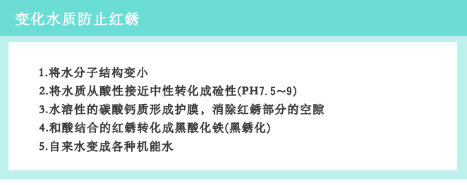 能防止老化的自来水管道中的水锈以及锈水乃是净水机的一大特征。 由于溶于水中的碳酸钙会将老化水管内部的不平整锈面渐渐密集覆盖,所以在日常用水之间就可以防止水\锈的发生。 |